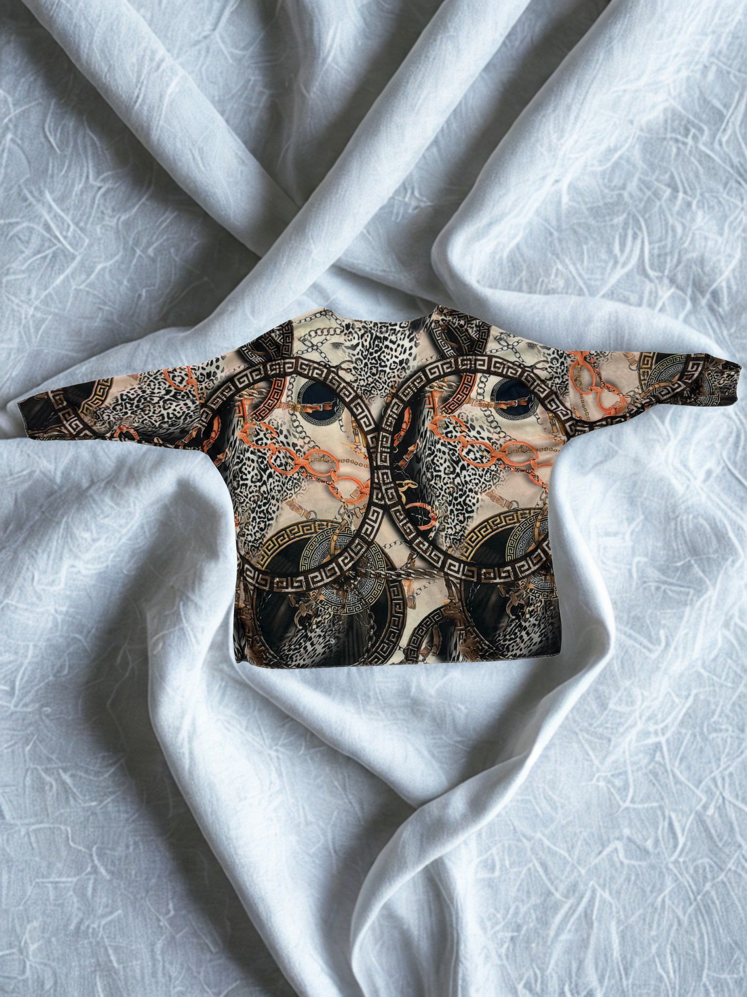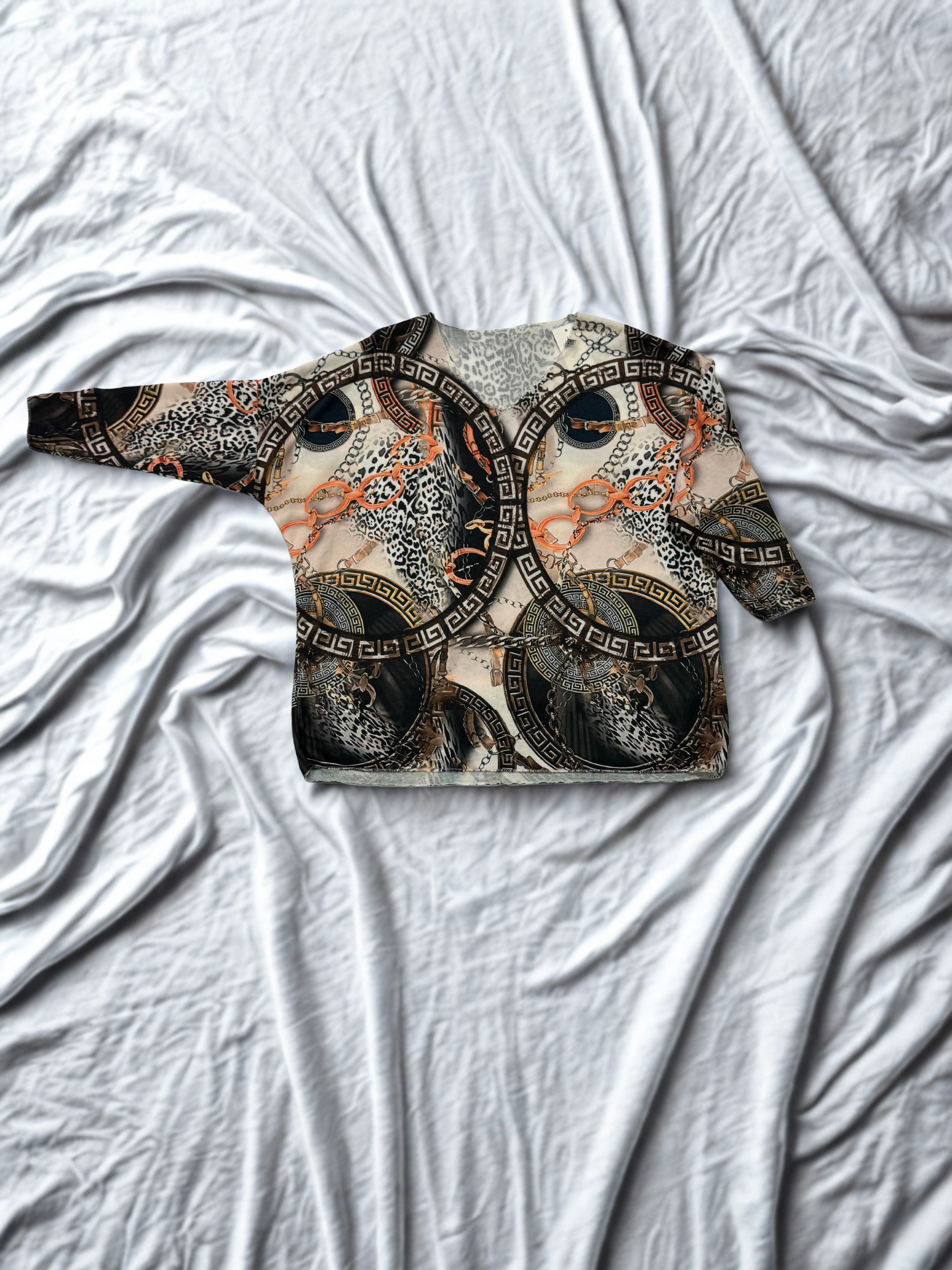 Se trata de un JERSEY de manga ancha con un estampado de cadenas, grecas y animal print.